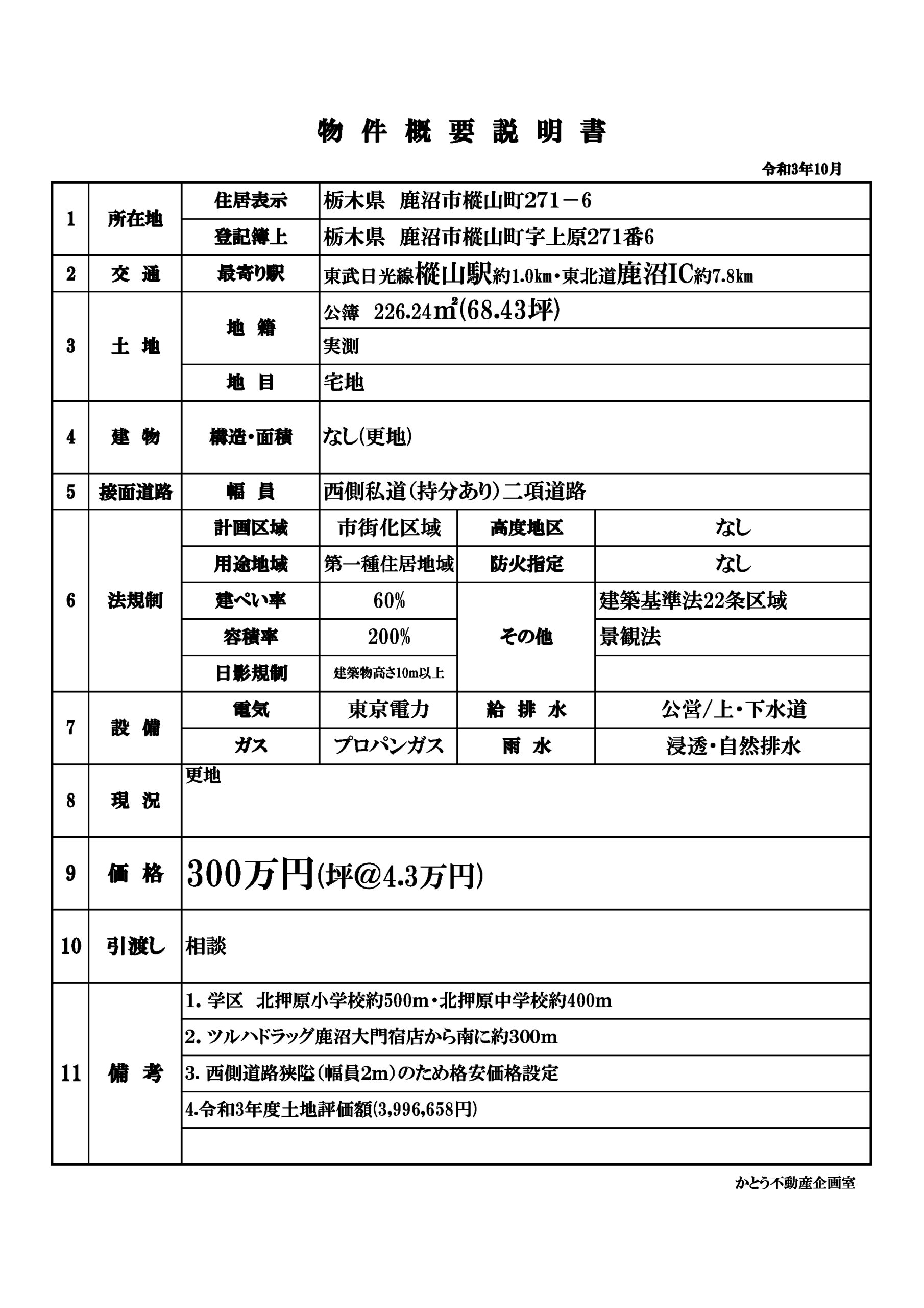 北押原小学校まで500m・68.43坪『300万円』 2021年11月9日2023年1月5日 東から撮影 かとう不動産企画室 ポスト シェア はてブ 送る Pocket 「かとう不動産企画室」はお客様の番頭です 人気エリア格安物件・進入道路狭いため思い切った価格設定です 狭隘道路(幅員2m)ですが閑静で広々とした敷地・日当たり良好! ・東武日光線樅山駅まで1km ・半径1km内ドラッグストア・スーパー・コンビニあります 進入道路 南から撮影 東から撮影 北から撮影 物件概要書 かとう不動産企画室「ラビーネット不動産HP」こちらからもどうぞ! お問合せ お名前 (必須) メールアドレス (必須) お問い合せ内容 メッセージ本文 Δ 関連